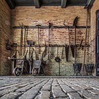 Tuingereedschap tegen een oude muur in het dorpje Marssum in Friesland in de entreepoort van het historische kasteeltje.