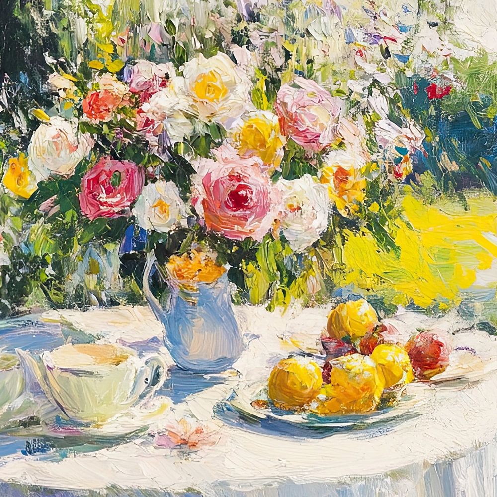 De stijl is impressionistisch, met brede, losse penseelstreken die het licht en de kleur laten leven. Het kleurgebruik is helder en vrolijk. Het wit van het tafelkleed vangen subtiele tinten blauw, lila en roze op, terwijl de bloemen fel afsteken met hun geel, roze en rood. Het groen van de tuin is vol en rijk, met sprankelende vlekken van geel zonlicht die de achtergrond bijna laten zingen. De sfeer is open en warm, zonder harde lijnen, alles stroomt in elkaar over zoals dat gebeurt op een zonnige dag.