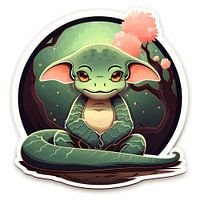 De afbeelding toont een cartooneske buitenaardse slang met oren die op de grond zit voor een boom en roze bloemen. De achtergrond is donker van kleur, wat een fantasierijke sfeer creëert. Het ontwerp is plat met vectorillustraties en een witte rand rond de scène.