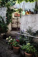 Tuintje in portugees bergdorp in avondzon. Bloempotten met planten voor een mooi roestig hek in Marvao , Portugal