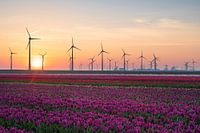 Paarse tulpen in de Eemspolder tijdens een kleurrijke zonsopkomst in het voorjaar. De tientallen windturbines rond de Eemshaven geven een moderne twist aan dit oer Hollandse onderwerp.