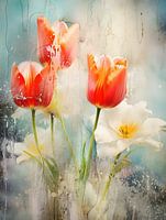 Het is een combinatie tussen verf, foto en tekening, met een zachte achtergrond.