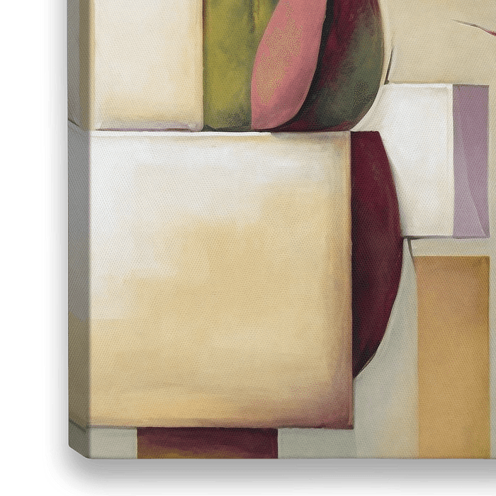Mixed media kunst met mosterdgeel, groen, crème en bordeauxrood tinten.