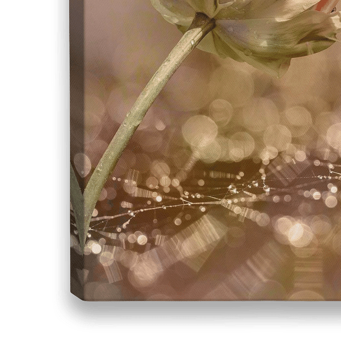 Een spinnenweb ligt als een weg van druppels achter de bloem.
