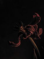 Uitgebloeide bloem van een tulp tegen een donkere zwarte achtergrond. Verval neergezet in de dramatische sfeer van de schilderijen van Oude Meesters.