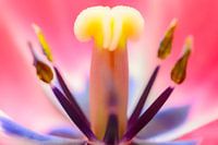 Macro close up foto van een roze en paarse tulp met duidelijk zichtbaar de stamper en meeldraden.
