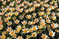 Een mooi beeld van een tulpenveldje. De gele hartjes zijn er voor bedoeld om nog meer bijtjes aan te trekken.