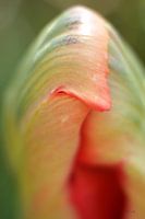 De tulp één van de dingen die genoemd worden wanneer het over Nederland gaat. Deze Parkiettulp zit nog in de knop. het zal nog even duren voor de barok aandoende bloem open gaat. het eerste rood verraad de kleur die de bloem zal hebben,