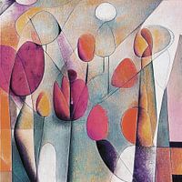 Abstracte tulpen met bordeauxrood, paars en oranje tinten op verweerd canvas.