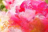 Tulpen Dromen, Deze close-up van tulpen ziet eruit als een droom. Een schilderachtige droom, waar je nog wat schetslijnen doorheen ziet en ook stukjes canvas. De tulp is een speciale met veel bloemblaadjes. welke precies, dat laat ik, in dit geval,liever aan de beschouwer over. De dromerige en toch frisse kleuren lopen van roze naar oranje, samen met geel, crème en groen vorm het een mooi toch wel wat abstract geheel. Een stilleven waar je heel fijn even bij weg kunt dromen.