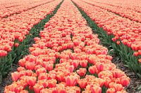 Rijen vol oranje tulpen trekken diep het landschap in. De symmetrie is bijna hypnotiserend: elke tulp staat keurig op haar plaats, alsof ze deel uitmaakt van een zorgvuldig ontworpen patroon. Deze opname uit de Noordoostpolder toont niet alleen de schoonheid van de tulp, maar ook het vakmanschap van de bloementeelt.