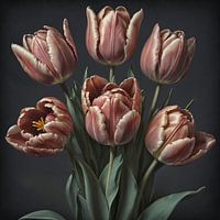 De tulpen zijn gedetailleerd weergegeven, met hun zachte kleuren en delicate vormen.