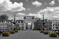 De opgang van de Magere brug in Amsterdam is opgesierd met bloembakken vol het kleurige tulpen. Dit werk is in zwart-wit met selectieve kleur uitgevoerd, waarbij de tulpen hun fleurige kleur hebben behouden. Van dit werk bestaat ook volledige kleuren uitvoering.