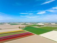 Tulpen op landbouwgronden in de Noordoostpolder in Flevoland, Nederland, in het voorjaar van bovenaf gezien. De Noordoostpolder is een polder in de voormalige Zuiderzee die aanvankelijk bedoeld was om meer land voor de landbouw te creëren.