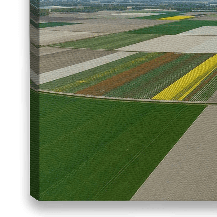 Tulpen op landbouwgronden in de Noordoostpolder in Flevoland, Nederland, in het voorjaar van bovenaf gezien. De Noordoostpolder is een polder in de voormalige Zuiderzee die aanvankelijk bedoeld was om meer land voor de landbouw te creëren.