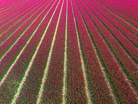 Roze tulpen in landbouwvelden in de Noordoospolder in Flevoland, Nederland, in het voorjaar van bovenaf gezien. De Noordoostpolder is een polder in de voormalige Zuiderzee, oorspronkelijk bedoeld om meer land voor de landbouw te creëren.