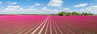 Roze bloeiende tulpen op bloembedden in een agrarisch bloemenveld in de Noordoostpolder, Flevoland tijdens een mooie lentedag met blauwe lucht en pluizige witte wolken van bovenaf gezien. De Noordoostpolder is een polder in de voormalige Zuiderzee, oorspronkelijk ontworpen om meer land voor de landbouw te creëren. Brede panoramafoto.