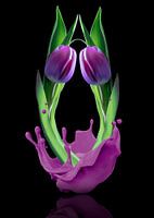 Leuke compositie van roze tulpen in een splash van "melk". De tulpen zijn gespiegeld en de splash is eigenlijk chocolade melk. Een leuke photoshop bewerking, eenvoudig, minimalistisch en kleurrijk. een sierraad aan de muur in elke voorjaarstuin.