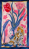 Op de voorgrond zit een majestueuze luipaard met opvallende zwarte stippen en een oranje vacht, rustend in een sierlijke houding. Achter de luipaard staat een vaas met twee grote tulpen, één in een diep rood en de ander in…