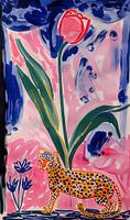 De luipaard, met zijn feloranje vacht en zwarte stippen, staat alert aan de onderkant van het schilderij. Zijn lichaam is sierlijk en elegant, met een subtiele beweging in zijn houding. Boven de luipaard torent een grote roze tulp uit, met dikke, groene bladeren die een gevoel van groei en leven geven. De achtergrond is gevuld met abstracte penseelstreken in blauw, roze en paarstinten, die een dromerige en bijna surrealistische sfeer creëren. De dikke contourlijnen omlijsten zowel de luipaard als de bloem, waardoor ze extra opvallen tegen de levendige achtergrond.