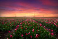 Mooie zonsondergang bij een tulpenveld in Flevoland met een mooie lijn windmolens op de achtergrond.