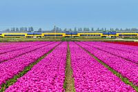 Prachtig symetrisch beeld van een paars tulpenveld met een trein op de achtergrond