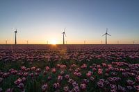 Een veld met bloeiende tulpen in de Noordoostpolder met op de achtergrond een dubbele rij windmolens in het IJsselmeer.