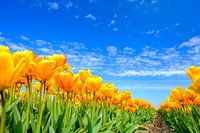 Tulpen in een veld tijdens een mooie lentedag in de Noordoostpolder in Flevoland, Nederland. Laag bovenaanzicht met een blauwe lucht boven het tulpenveld.