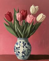 Tulpen in Blauw-Wit – Een Ode aan Vorm en Kleur is een expressief olieverfschilderij waarin een klassiek onderwerp – tulpen in een vaas – op speelse en moderne wijze wordt benaderd. In dit werk staat een karaktervolle, oude blauw-witte vaas centraal, gevuld met levendige tulpen in tinten van roze en rood, met frisgroen blad dat zich sierlijk uitstrekt in de ruimte.