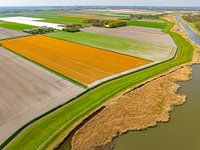Tulpenbloemen in een veld in de lente van bovenaf gezien met wolken in de lucht. Het bloembollenveld ligt in Noord-Holland, een van de bekendste gebieden voor tulpenvelden in Nederland. Uitzicht van bovenaf.
