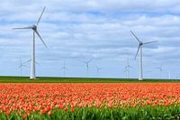 Tulpen in bloei op een akker in het voorjaar met windturbines op de achtergrond in de Noordoostpolder, Flevoland, Nederland. De Noordoostpolder is een polder in de voormalige Zuiderzee, oorspronkelijk ontworpen om meer land voor de landbouw te creëren.