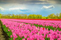 Kleurrijke bloeiende tulpenbloemen in een veld omringd door bomen tijdens de lente met stormachtige wolken erboven. Het bloembollenveld ligt in Drenthe, een minder bekend gebied voor tulpenvelden.