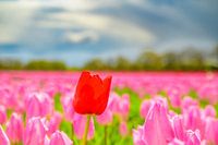 Kleurrijke bloeiende tulpenbloemen in een veld omringd door bomen tijdens de lente met stormachtige wolken erboven. Het bloembollenveld ligt in Drenthe, een minder bekend gebied voor tulpenvelden. Eén rode tulp steekt af tegen de rest van het veld.