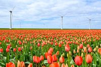 Tulpen in bloei op een akker in het voorjaar met windturbines op de achtergrond in de Noordoostpolder, Flevoland, Nederland. De Noordoostpolder is een polder in de voormalige Zuiderzee, oorspronkelijk ontworpen om meer land voor de landbouw te creëren.