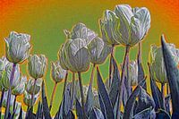 Tulpen in de lente. Tulpenveld in de polder, Nederland. Witte tulpen. De foto is digitaal bewerkt. Het heeft nu de uitstraling van een impressionistisch schilderij. Laag standpunt. De typisch Nederlandse bloem.