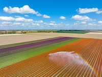 Tulpen groeien in een landbouwveld in rijen met een irrigatiepistool dat water over de bloemen sproeit in Flevoland, Nederland, tijdens de lente van bovenaf gezien tijdens een mooie lentemiddag. Bloemen zijn een van de belangrijkste exportproducten in Nederland en met name tulpen en tulpenbollen.
