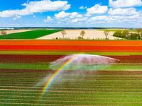 Tulpen groeien in een landbouwveld in rijen met een irrigatie waterkanon dat water over de bloemen sproeit in Flevoland, Nederland, tijdens de lente van bovenaf gezien tijdens een mooie lentemiddag. Bloemen zijn een van de belangrijkste exportproducten in Nederland en met name tulpen en tulpenbollen.