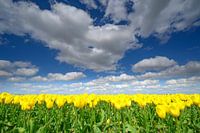 Gele tulpen op landbouwgrond in de Noordoostpolder in Flevoland, Nederland, in het voorjaar. De Noordoostpolder is een polder in de voormalige Zuiderzee die aanvankelijk bedoeld was om meer land voor de landbouw te creëren.