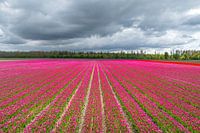 Roze tulpen groeien in landbouwvelden in de Noordoostpolder in Flevoland, Nederland, in de lente van bovenaf gezien. De Noordoostpolder is een polder in de voormalige Zuiderzee die in eerste instantie is ontworpen om meer land voor landbouw te creëren en is een van de grootste bloembollenteeltgebieden in Nederland.