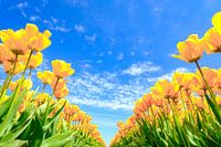 Gele tulpen in een veld tijdens een mooie lentedag in de Noordoostpolder in Flevoland, Nederland. Laag bovenaanzicht met een blauwe lucht boven het tulpenveld.