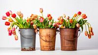 Tulpen, in allerlei kleuren rood en oranje, staan in drie emmers. De emmers zijn van zink en koper en zijn oud en beginnen te roesten. De tulpen zijn niet erg vers meer en beginnen te hangen, langzaam verwelken ze. De achtergrond is wit waardoor de kleuren van de tulpen nog beter uitkomen. Het beeld is met behulp van ai gegenereerd.