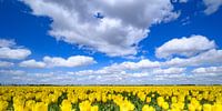 Gele tulpen op landbouwgrond in de Noordoostpolder in Flevoland, Nederland, in het voorjaar. De Noordoostpolder is een polder in de voormalige Zuiderzee die aanvankelijk bedoeld was om meer land voor de landbouw te creëren.