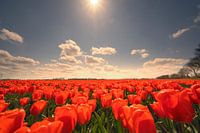 Rode tulpen groeien in het voorjaar op landbouwgrond in de Noordoostpolder in Flevoland, Nederland. De Noordoostpolder is een polder in de voormalige Zuiderzee die aanvankelijk bedoeld was om meer land voor de landbouw te creëren.