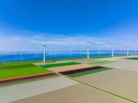 Windturbines met tulpen op landbouwvelden in de Noordoostpolder in Flevoland, Nederland, in het voorjaar van bovenaf gezien. De Noordoostpolder is een polder in de voormalige Zuiderzee die aanvankelijk bedoeld was om meer land voor de landbouw te creëren.