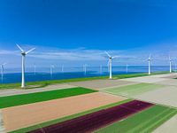 Windturbines met tulpen op landbouwvelden in de Noordoostpolder in Flevoland, Nederland, in het voorjaar van bovenaf gezien. De Noordoostpolder is een polder in de voormalige Zuiderzee die aanvankelijk bedoeld was om meer land voor de landbouw te creëren.