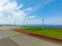 Tulpen in landbouwvelden met rijen windturbines aan de IJsselmeerkust op de achtergrond in de Noordoostpolder in Flevoland, Nederland, in het voorjaar van bovenaf gezien. De Noordoostpolder is een polder in de voormalige Zuiderzee, oorspronkelijk bedoeld om meer land voor de landbouw te creëren.