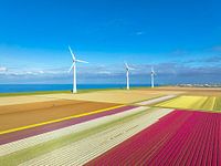 Tulpen in de landbouwvelden met op de achtergrond rijen windmolens aan de IJsselmeeroever in de Noordoostpolder in Flevoland, Nederland, in de lente van bovenaf gezien. De Noordoostpolder is een polder in de voormalige Zuiderzee, in eerste instantie ontworpen om meer land voor landbouw te creëren.