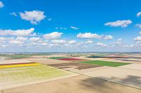 Tulpen groeien in landbouwvelden in de Noordoostpolder in Flevoland, Nederland, in de lente van bovenaf gezien. De Noordoostpolder is een polder in de voormalige Zuiderzee die in eerste instantie is ontworpen om meer land voor landbouw te creëren.