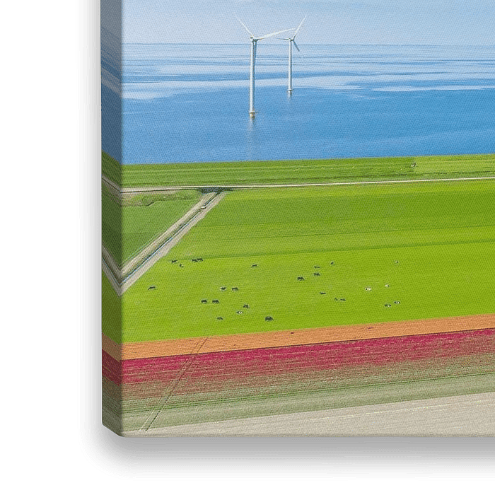 Windmolens met tulpen in landbouwvelden in de Noordoostpolder in Flevoland, Nederland, in het voorjaar van bovenaf gezien met windmolens op de achtergrond. De Noordoostpolder is een polder in de voormalige Zuiderzee die aanvankelijk bedoeld was om meer land voor de landbouw te creëren.