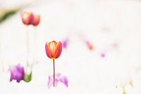Zacht wit tulpenveld met rood gekleurde tulpen die er boven uit komen op Goeree Overflakkee.